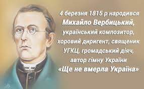 Сьогодні, 4 березня, виповнюється 206 років від Дня народження композитора, диригента, громадського діяча, автора музики до Українського Державного Гімну «Ще не вмерла Україна» Михайла Вербицького.