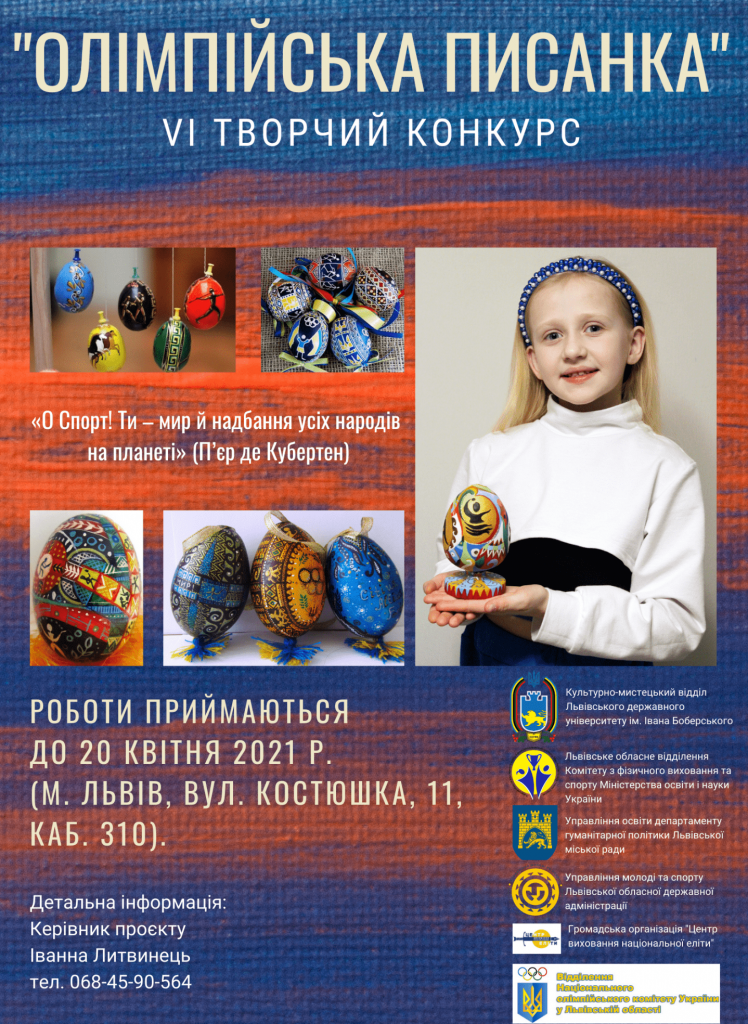 До 20 квітня талановиті діти Львівщини можуть долучитись до написання олімпійських писанок. На творців найкращих робіт чекають вартісні подарунки. Найяскравіші роботи потраплять у підсумковий каталог поруч з шедеврами п’яти попередніх проєктів.