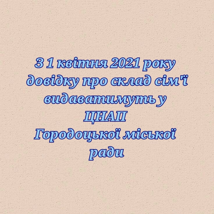 У зв’язку з формуванням реєстру жителів Городоцької територіальної громади, з 1 квітня 2021 рокудовідку про склад сім’ї видаватимуть у ЦНАП Городоцької міської ради.