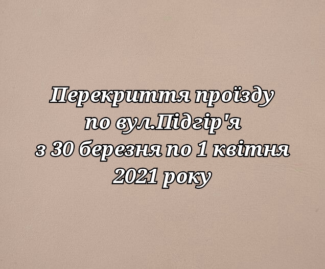 30.03.2021У зв’язку з ремонтом ділянки каналізації по вул. Підгір’я буде перекрито проїзд по вул. Підгір’я від перехрестя Українська-Підгір’я до вул. Шевченка з 30 березня по 1 квітня 2021 року.