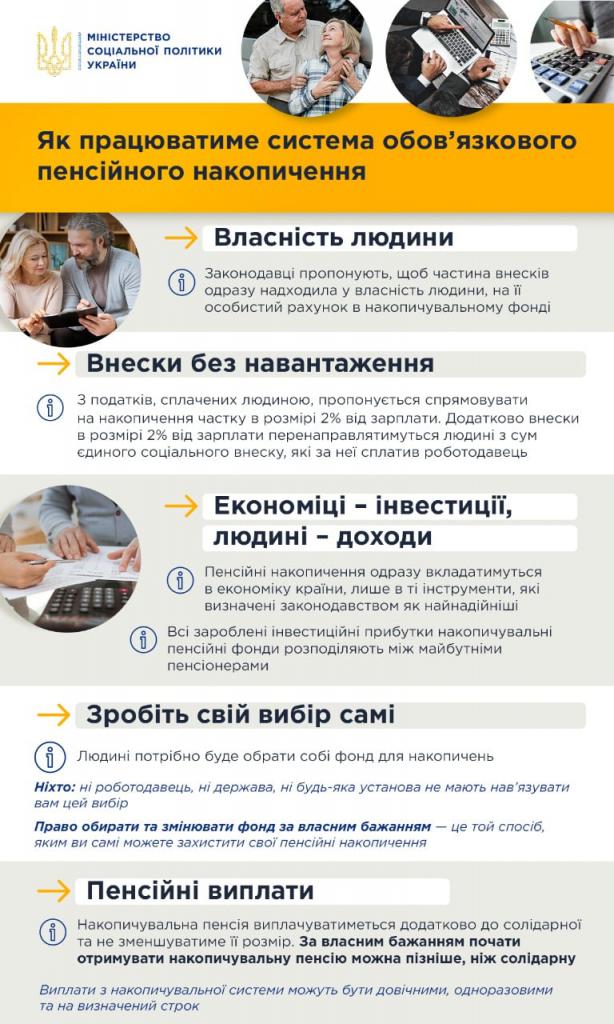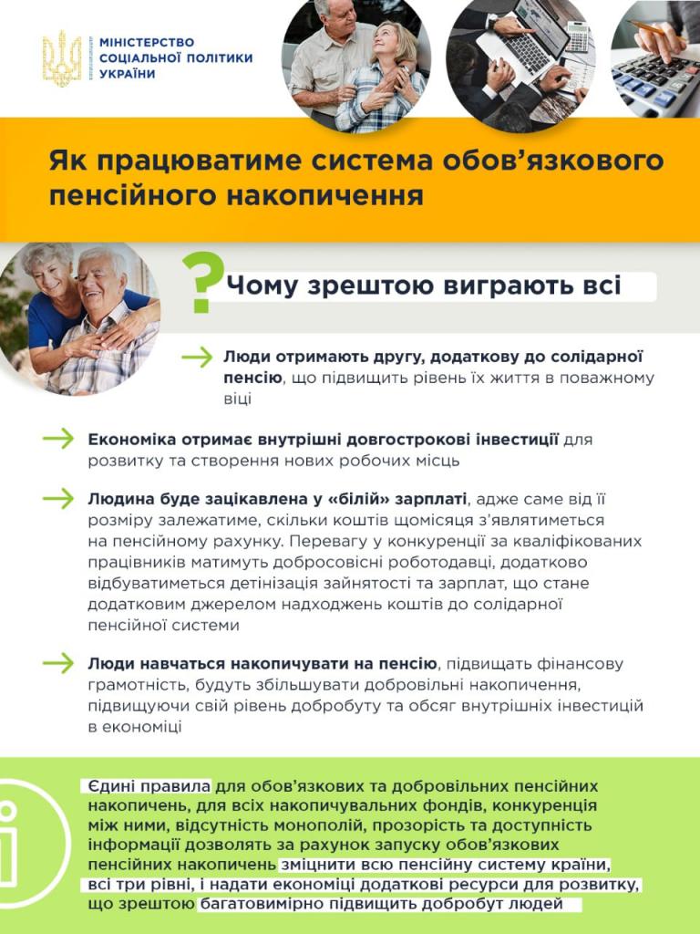 Таким чином пенсійні накопичення будуть внутрішніми інвестиціями, які допомагатимуть економіці зростати, а кожен учасник системи пенсійних накопичень – інвестором своєї країни, який отримує від своїх інвестицій дохід. Саме так відбувається в 77 країнах світу, про що ми писали ось тут https://www.msp.gov.ua/news/19830.html.