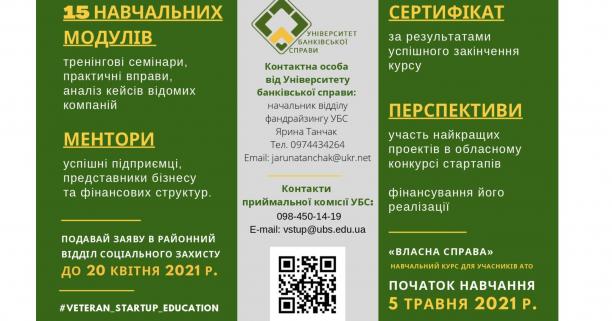 Університет банківської справи у співпраці з Мінветеранів проводить навчальний курс «Власна справа» для учасників та учасниць АТО/ООС в межах проєкту «VETERAN START-UP EDUCATION».