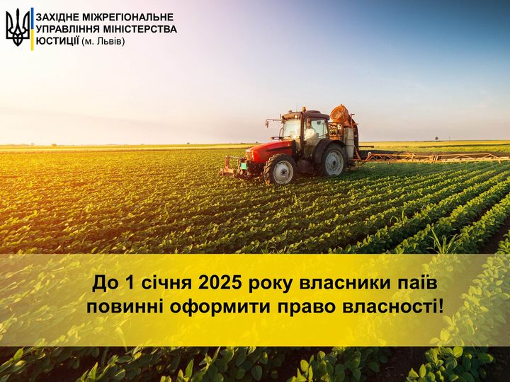 Слід звернути увагу, що у разі якщо до 1 січня 2025 року власник земельної частки (паю) або його спадкоємець не оформить право власності на земельну ділянку, він вважатиметься таким, що автоматично відмовився від земельної ділянки і вона перейде у комунальну власність.