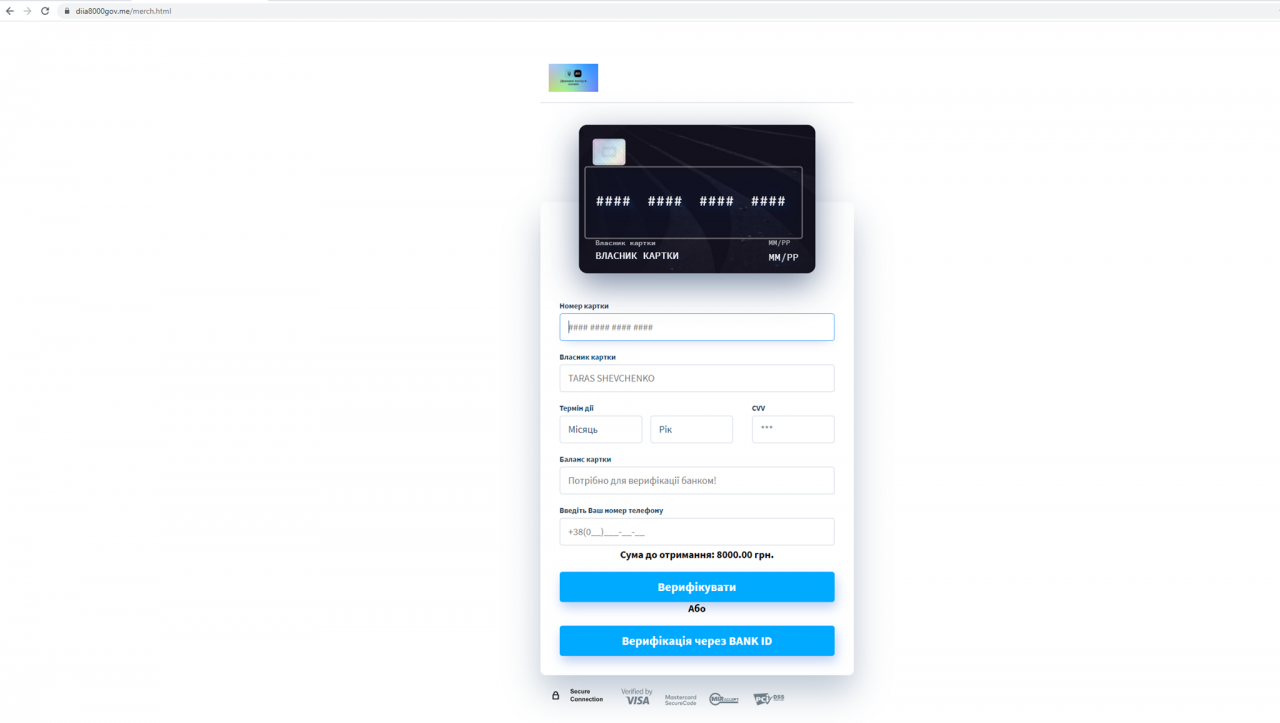 Після чого користувач перенаправляється на сторінку hXXps://diia8000gov[.]me/merch.html, на якій пропонується ввести дані своїх кредитних карток.