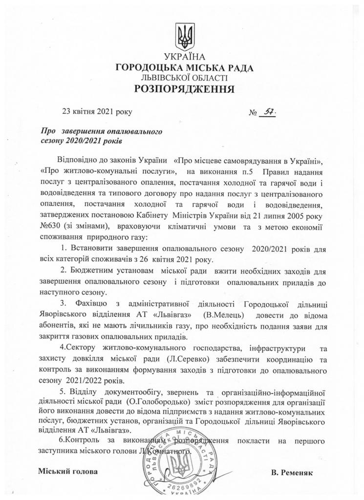 Розпорядження міського голови №57 від 23 квітня 2021 року "Про завершення опалювального сезону 2020/2021 років"