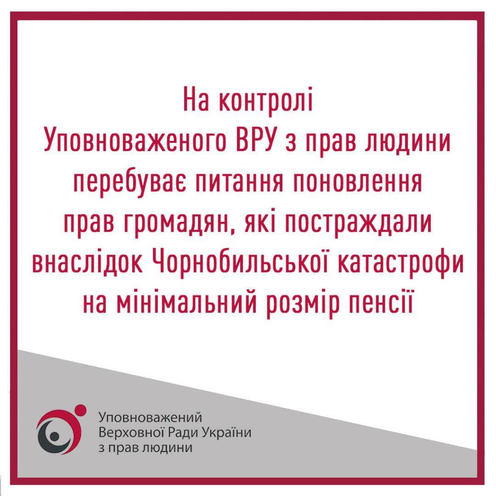 Питання поновлення прав громадян, які постраждали внаслідок Чорнобильської катастрофи на мінімальний розмір пенсії перебуває на постійному контролі Уповноваженого ВРУ з прав людини.