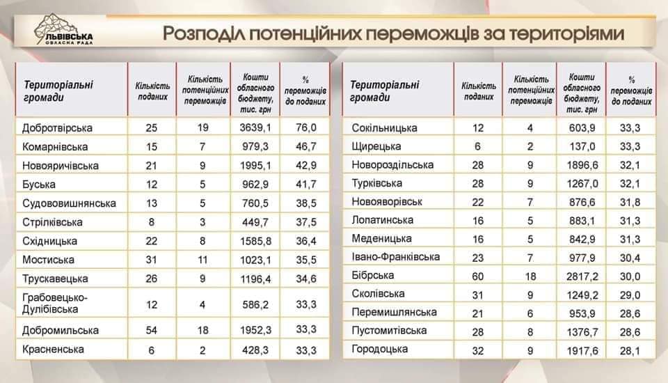 Потенційні переможці мають до 28 травня включно подати рішення органів місцевого самоврядування про забезпечення бюджетного співфінасування у розрізі проєктів до Львівської облради на електронну адресу: microproekt@gmail.com.