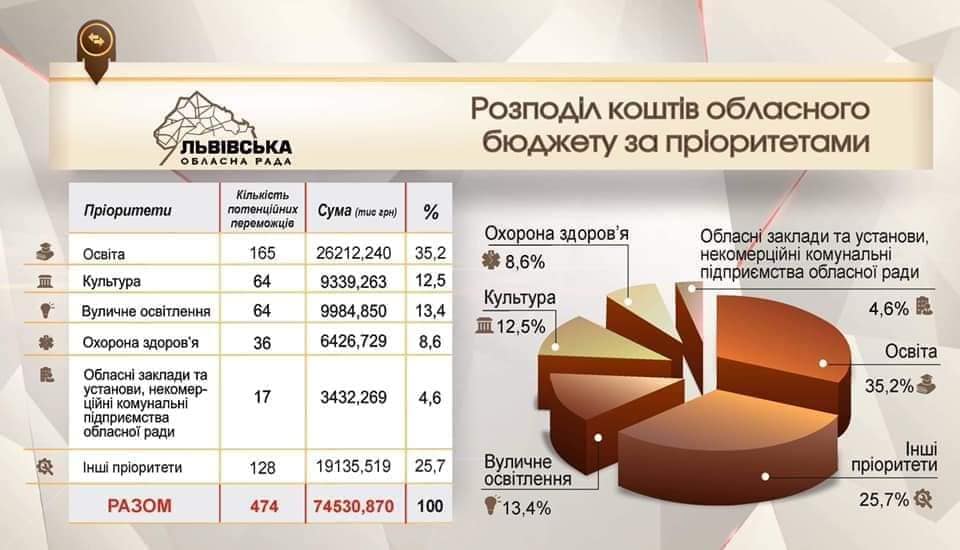 Загальна сума з обласного бюджету на реалізацію 474 проєктів – 74,53 млн грн. Загальна ж їх вартість – 152,92 млн грн. Залучено коштів місцевих бюджетів – 38,53 млн грн, а небюджетний внесок становить – 39,86 млн грн. Загалом же на Програму з обласного бюджету планують скерувати 75 млн грн.