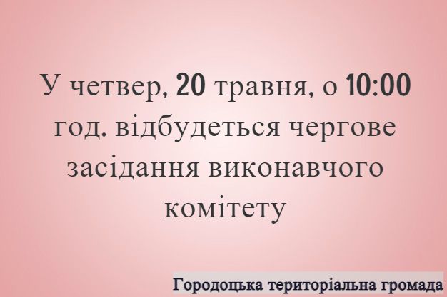 17.05.2021У четвер, 20 травня 2021 року, о 10:00 год. у приміщенні зали засідань Городоцької міської ради відбудеться чергове засідання виконавчого комітету.