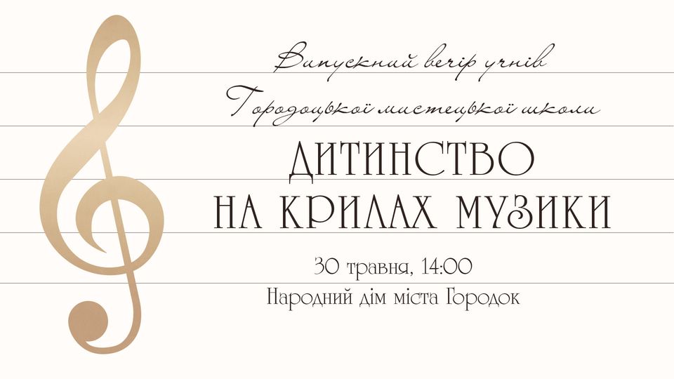 26.05.2021Шановні жителі громади! Запрошуємо на випускний вечір учнів Городоцької мистецької школи "Дитинство на крилах музики"! Місце: Народний дім міста Городок Час: 30 червня, о 14:00 год