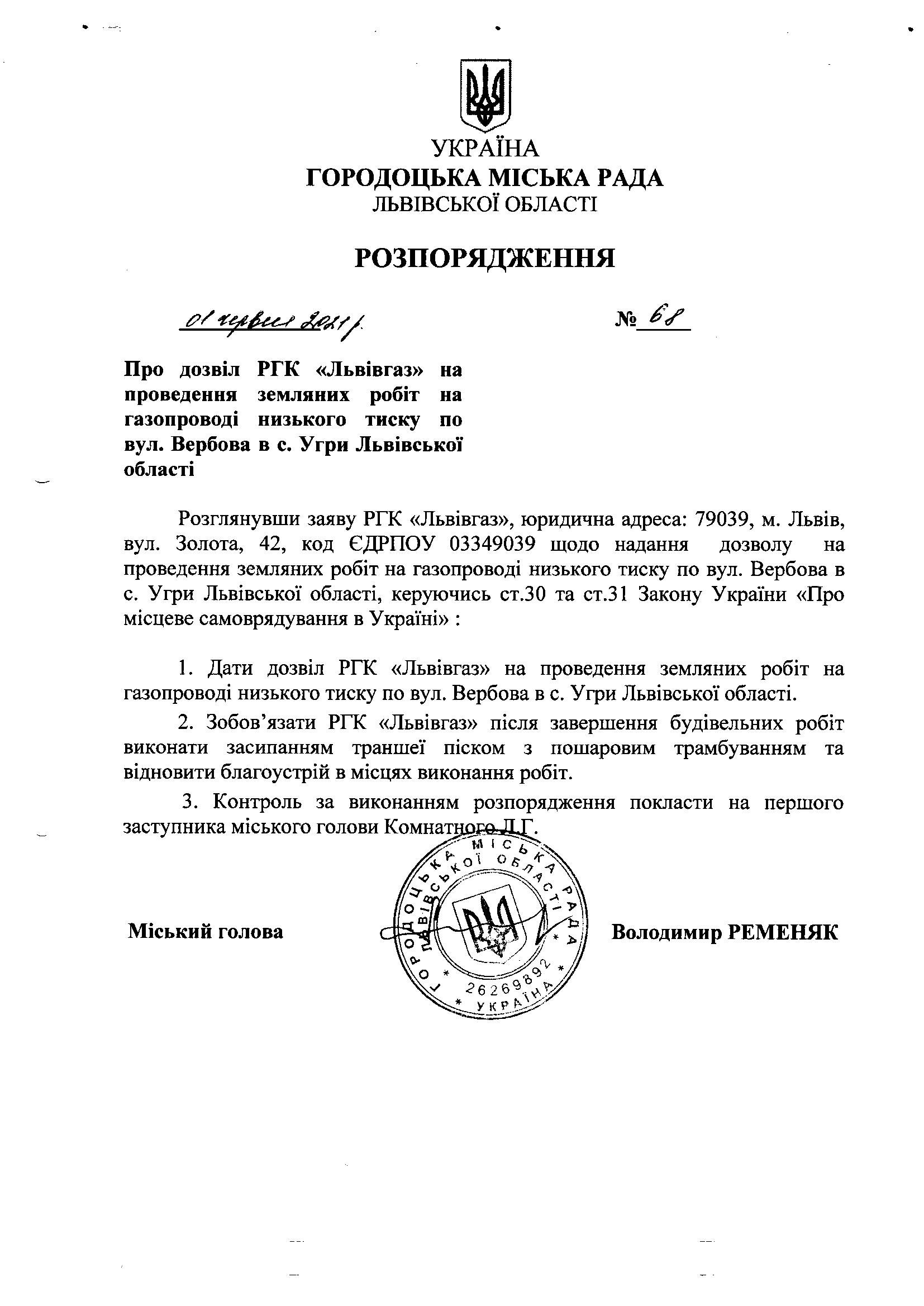 Розпорядження міського голови №68 від 1 червня 2021 року "Про розподіл РГК "Львівгаз" на проведення земельних робіт на газопроводі низького тиску по вул.Вербова в с.Угри Львівськохї області"