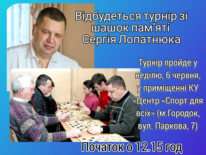 У неділю, 6 червня, у приміщенні КУ «Центр «Спорт для всіх» (м.Городок, вул. Паркова, 7) відбудеться шашковий турнір пам’яті Сергія ЛОПАТНЮКА.