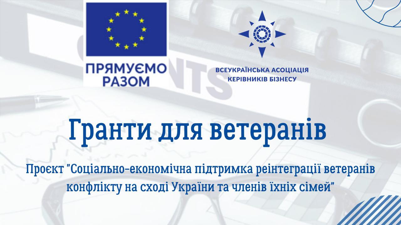 Всеукраїнська Асоціація Керівників Бізнесу в рамках проєкт «Соціально-економічна підтримка реінтеграції ветеранів конфлікту на сході України та членів їхніх сімей», що фінансується Європейським Союзом, оголошує набір зацікавлених ветеранів конфлікту на сході України до участі в компоненті проєкту щодо розбудови спроможності із започаткування та розвитку бізнесу з можливістю отримання грантової допомоги у вигляді обладнання для Вашої справи. Заявки приймаються до 1️липня 2021 року.