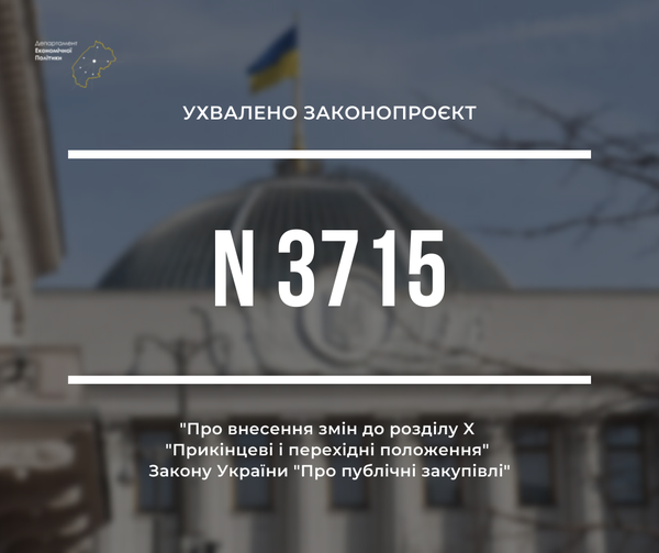 Вчора на пленарному засіданні Верховна Рада України ухвалила законопроєкт №3715 "Про внесення змін до розділу X "Прикінцеві і перехідні положення" Закону України "Про публічні закупівлі" (щодо виключення можливості здійснення закупівель без використання електронної системи закупівель)".