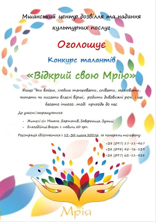 Шановні жителі сіл Мшана, Бартатів, Заверешиці, Зушиці запрошуємо вас взяти участь у конкурсі талантів Відкрий свою мрію".