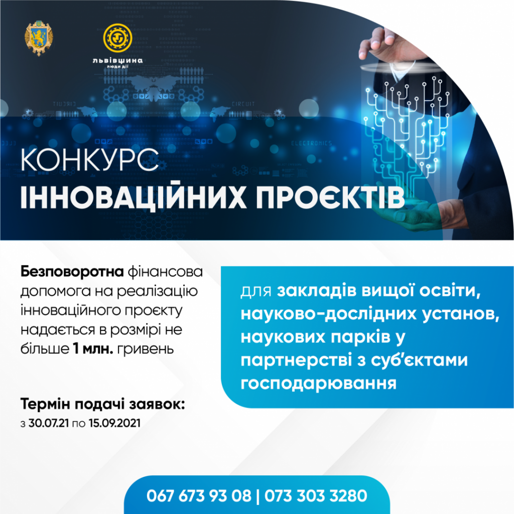 Департамент економічної політики Львівської облдержадміністрації, у межах реалізації Програми сприяння інноваційному та науково-технологічному розвитку у Львівській області на 2021-2025 роки, розпочав прийом заявок на конкурс інноваційних проєктів для закладів вищої освіти, науково-дослідних установ, наукових парків у партнерстві з суб’єктами господарювання, що зареєстровані та здійснюють господарську діяльність на території Львівської області.