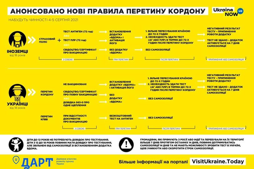 - наявність страхового полісу на випадок захворювання на Covid-19 та негативний результат тестування на коронавірус методом ПЛР або експрес-тесту на антиген, зроблений не раніше, ніж за 72 години до перетину кордону;