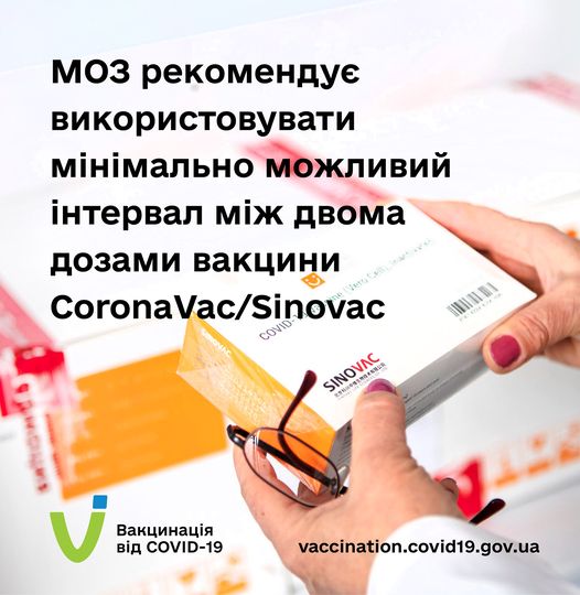 У зв’язку зі стрімким поширенням штаму коронавірусу SARS-CoV-2 «Дельта», поступовим зростанням захворюваності в Україні та необхідністю якнайшвидше забезпечити захистом якомога більше українців, Міністерство охорони здоров’я рекомендує скоротити інтервал між першою та другою дозою вакцини CoronaVac від Sinovac Biotech до мінімального терміну, зазначеного в офіційній інструкції, – 14 днів.