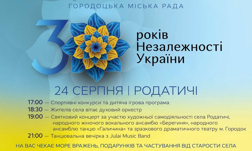 Святкові заходи з нагоди 30-річчя Незалежності України. Запрошуємо 24 серпня у с.Родатичі.