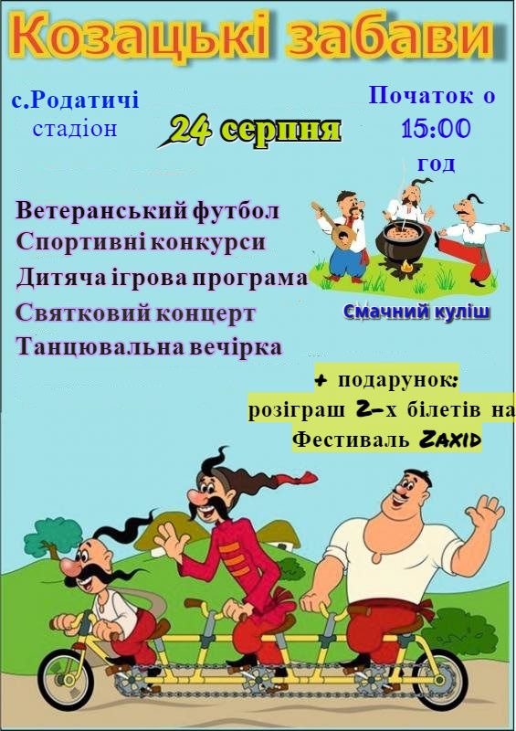 Запрошуємо 24 серпня у с.Родатичі на святкове дійство «Козацькі забави», присвячене 30-річчю Незалежності України.