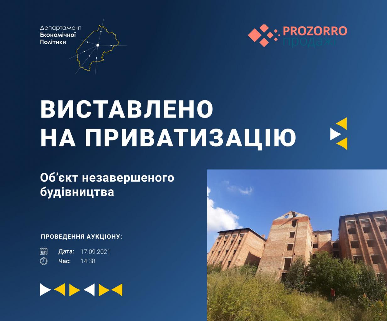 До уваги потенційних інвесторів – продаж об’єкта малої приватизації комунальної власності Городоцької міської ради На аукціон виставлено об'єкт незавершеного будівництва у м. Городок площею 5033,3 м.кв (відсоток готовності об'єкта становить 55%). Цегляна чотирьохповерхова будівля висотою 17 м з підвалом і мансардою. Інженерні мережі до будівлі не підведені. Розташована у районі громадсько-житлової забудови, поблизу навчально-виховний комплекс та дитячий садок, зручне транспортне сполучення. Дата проведення аукціону: 17.09.2021 14:38 Стартова ціна продажу: 11,330 млн грн без ПДВ Детальніше про об'єкт: https://prozorro.sale/auction/UA-PS-2021-08-29-000003-2
