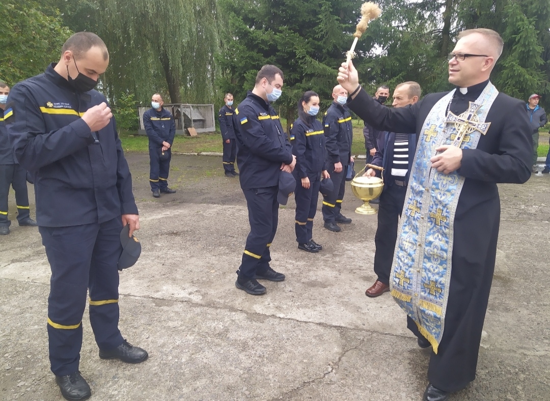 Отець Михайло з Божим благословення на щасливу працю окропив свяченою водою усіх присутніх та спецавтомобілі надзвичайників.