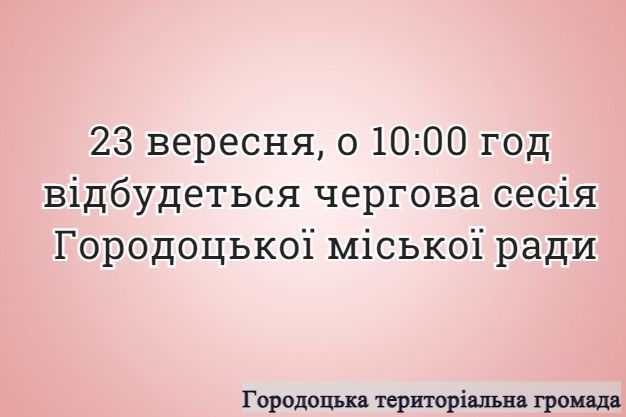 22.09.2021У четвер, 23 вересня, відбудеться чергова ХІІ сесія Городоцької міської ради VIII скликання. Сесія відбудеться у приміщенні Народного дому м.Городка. Початок – о 10:00 год.