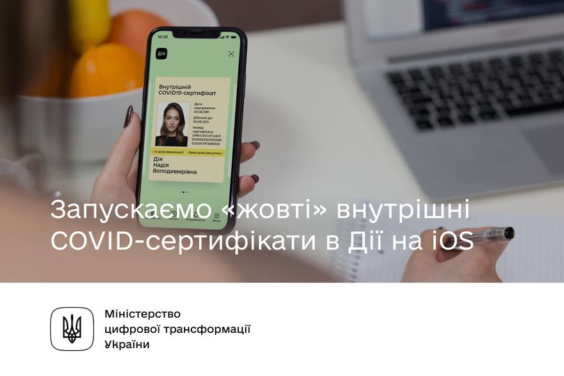Користувачі iOS зможуть згенерувати “жовті” внутрішні COVID-сертифікати в застосунку Дія. Згодом вони стануть доступними і для власників Android, чекаємо на підтвердження від Google Play. “Жовтий” сертифікат можна отримати наступного дня після першої дози вакцинації дводозною вакциною. Він діятиме 120 днів.