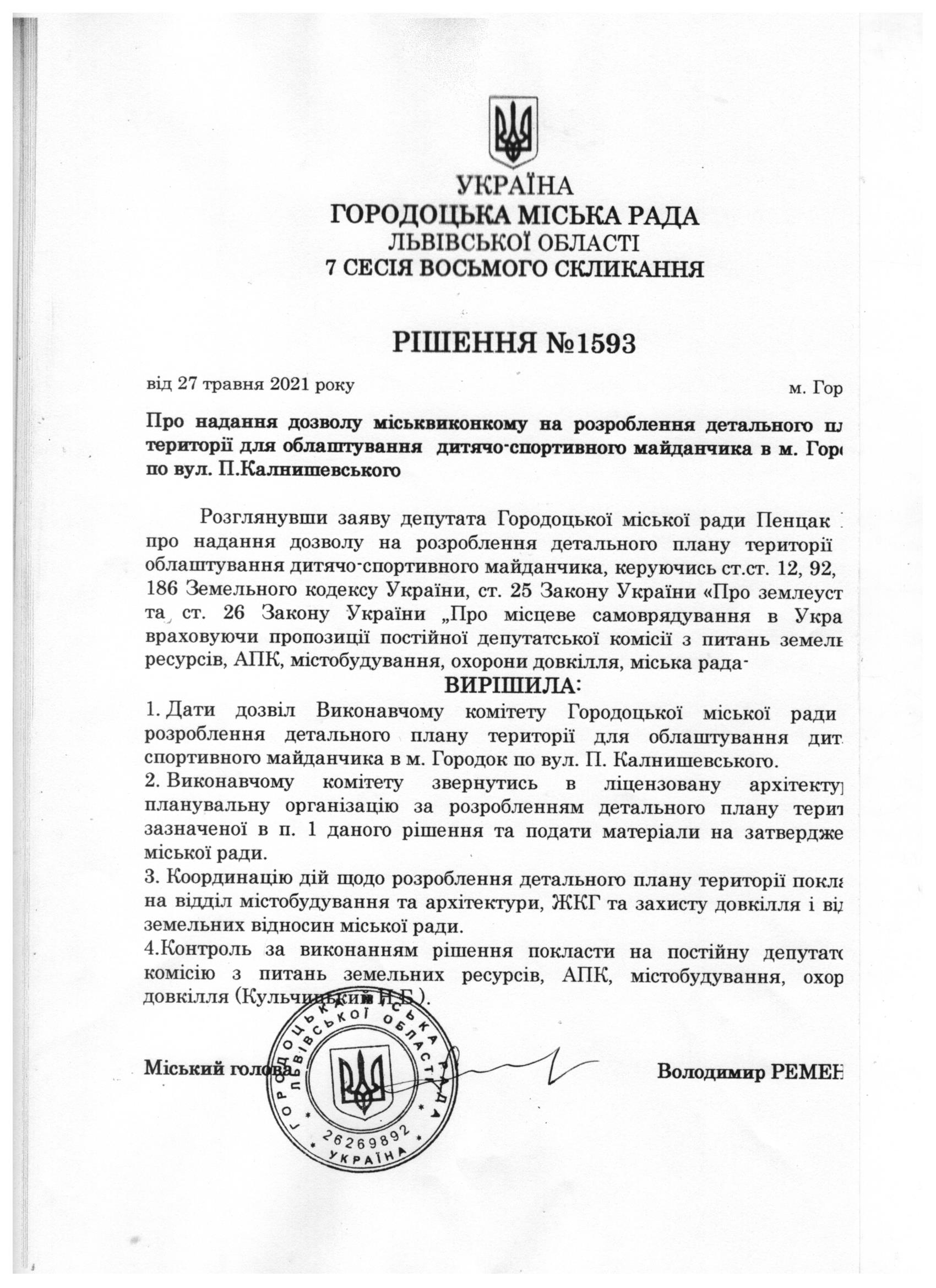 Проводяться громадські слухання ДПТ для облаштування дитячо-спортивного майданчика на вул.П.Калнишевського в м.Городок Львівської області згідно рішення VII сесії восьмого скликання від 27.05.2021 року №1593.