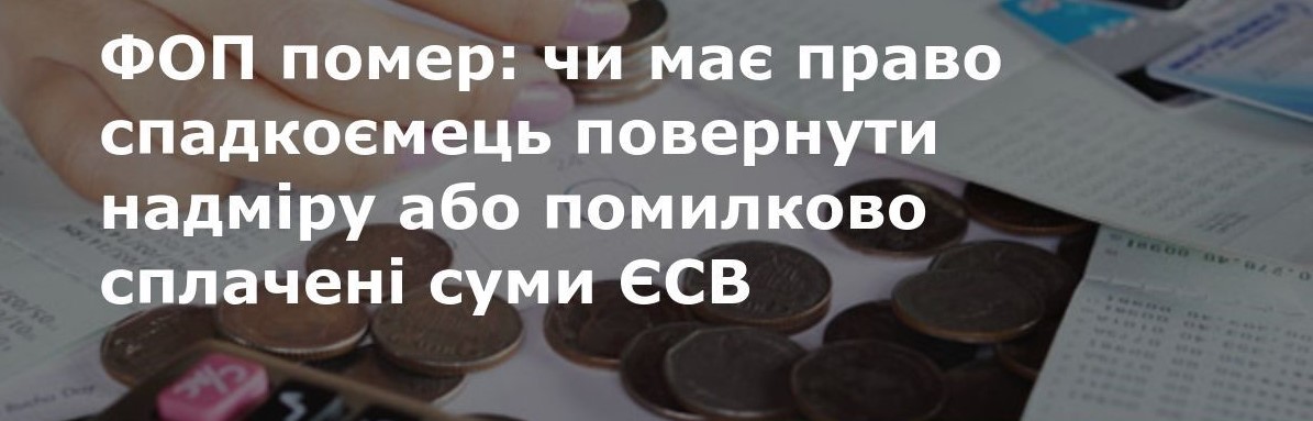 Отже, у разі смерті ФОП – платника ЄВ його спадкоємець не має право на повернення надміру або помилково сплачених сум ЄВ, оскільки у розумінні Закону № 2464 спадкоємець не є платником ЄВ і на нього не розповсюджуються права та обов’язки платника.