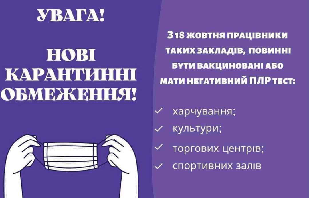 З 18 жовтня працівники таких закладів, повинні бути вакциновані або мати негативний ПЛР тест: