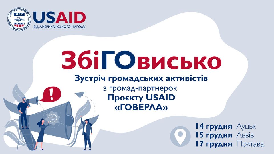 Проєкт Агентства США з міжнародного розвитку (USAID) «Підвищення ефективності роботи та підзвітності органів місцевого самоврядування» («ГОВЕРЛА») організовує вокшоп «ЗбіГОвисько» для громадських активістів партнерських громад. Метою зустрічі є знайомство з активними представниками місцевих громадських організацій, ініціативних груп та громадських рад, а також обговорення потреб громадського сектору громад та можливостей співпраці в рамках Проєкту USAID «ГОВЕРЛА».