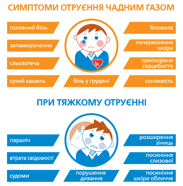 Потрапляючи в кров людини, чадний газ зв’язується з гемоглобіном, утворюючи сполуку, яка блокує передачу кисню до тканин організму. Як наслідок – виникають головний біль, задуха, стук у скронях, запаморочення, біль у грудях, сухий кашель, нудота, блювання, зорові та слухові галюцинації, підвищений артеріальний тиск. У важких випадках – параліч, судоми, втрата свідомості та, як наслідок, смерть протягом 3 хвилин.