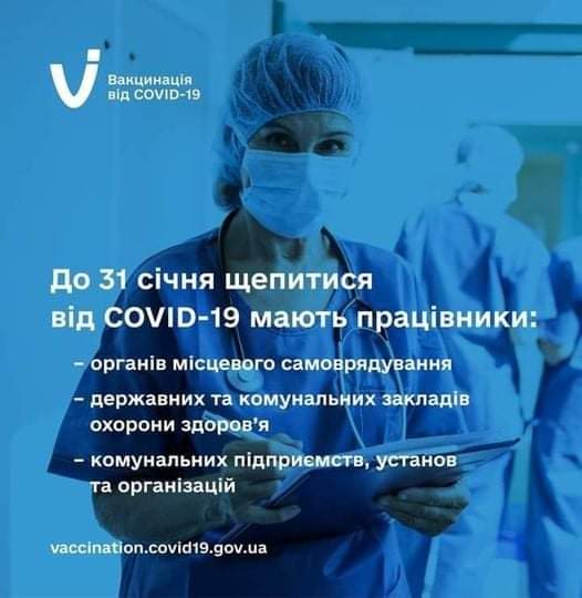 З 31 січня 2022 року працівники органів місцевого самоврядування, державних та комунальних закладів охорони здоров’я, комунальних підприємств, установ та організацій, які не отримають принаймні однієї дози вакцини від COVID-19, будуть відсторонені від роботи (наказ МОЗ ✓2664 від 30.11.2021 року).