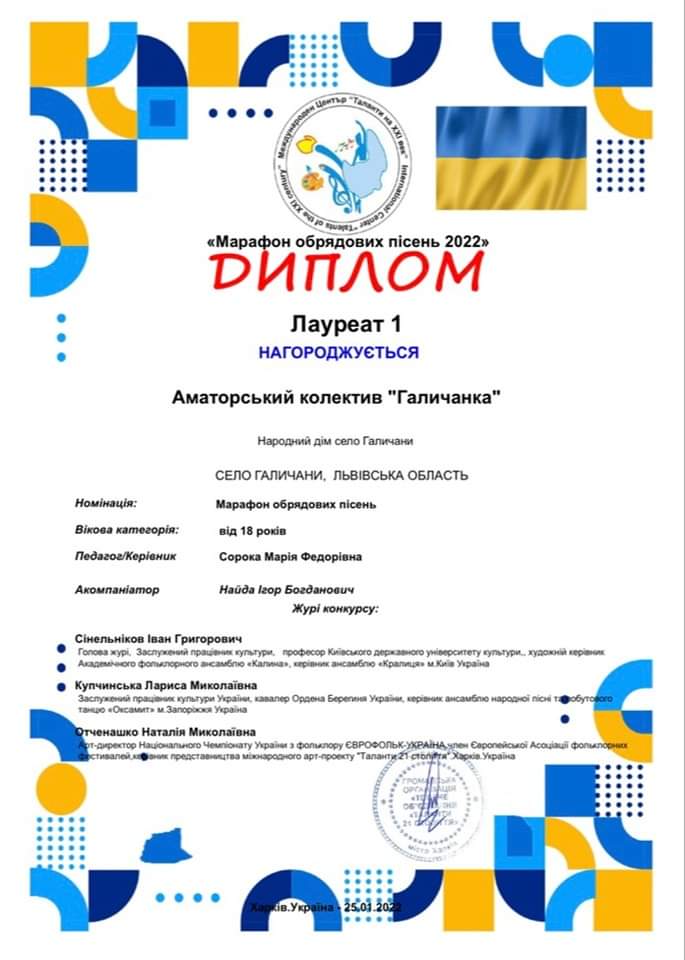 Вітаємо аматорський вокальний жіночий колектив "Галичанка" з перемогою у онлайн марафоні обрядових пісень "EUROFOLK-Україна 2022"! Молодці! До нових перемог!
