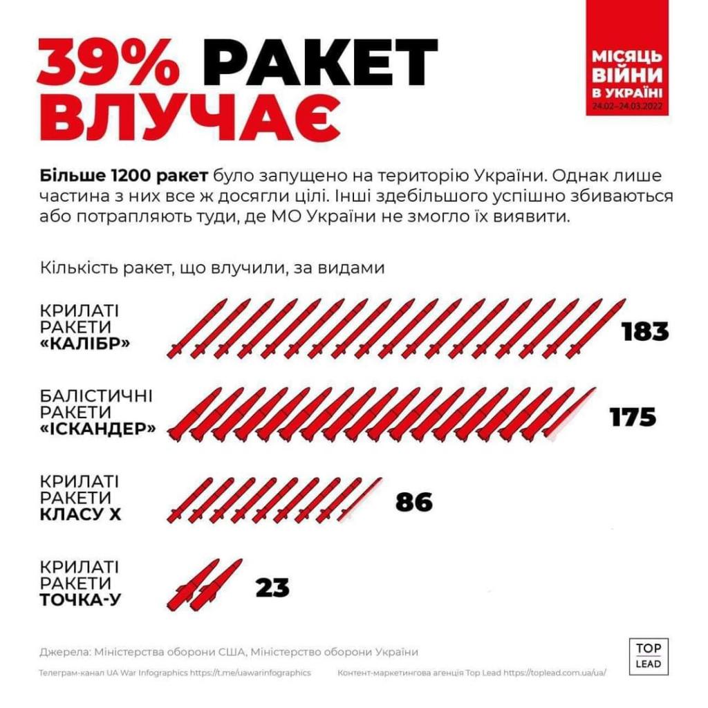 25.03.2022Тільки 39% випущених Росією по Україні ракет досягли своїх цілей Загалом РФ запустила за нами приблизно 1200 ракет, що вразили мету менше половини. Інші або збиті ППО, або потрапили повз – у гори, у ліс, у річки...
