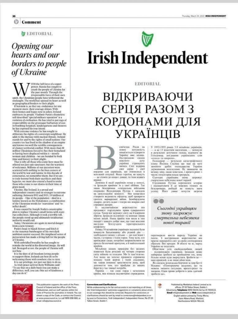 Вперше за час свого існування з 1905 року найпопулярніша газета Ірландії "Irish Independent" опублікувала головну редакційну статтю не ірландською чи англійською мовою, а українською.