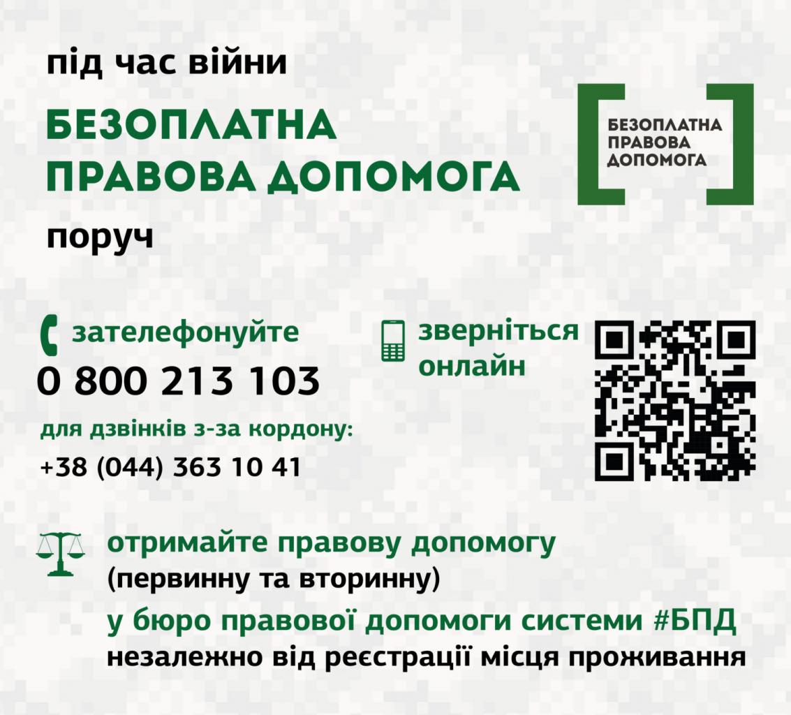 Єдиний номер контактного центру системи БПД 0 800 213 103 в умовах воєнного стану є найоперативнішим і найдоступнішим способом отримання правової інформації. За цим номером надаються консультації та роз’яснення з правових питань, додаткові відомості про надання безоплатної правової допомоги тощо. Дзвінки зі стаціонарних та мобільних телефонів у межах України безкоштовні.
