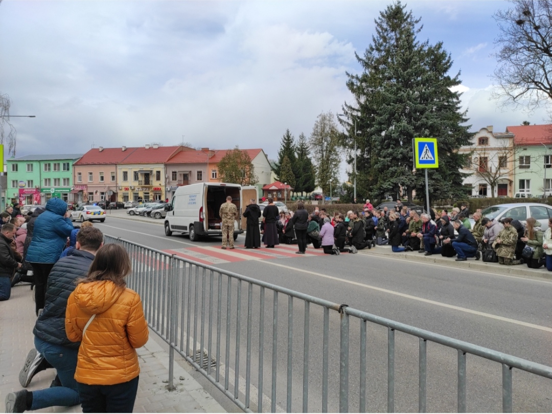 Стоячи на колінах, городківчани зустріли траурний кортеж із домовиною Героя Володимира Липовецького.