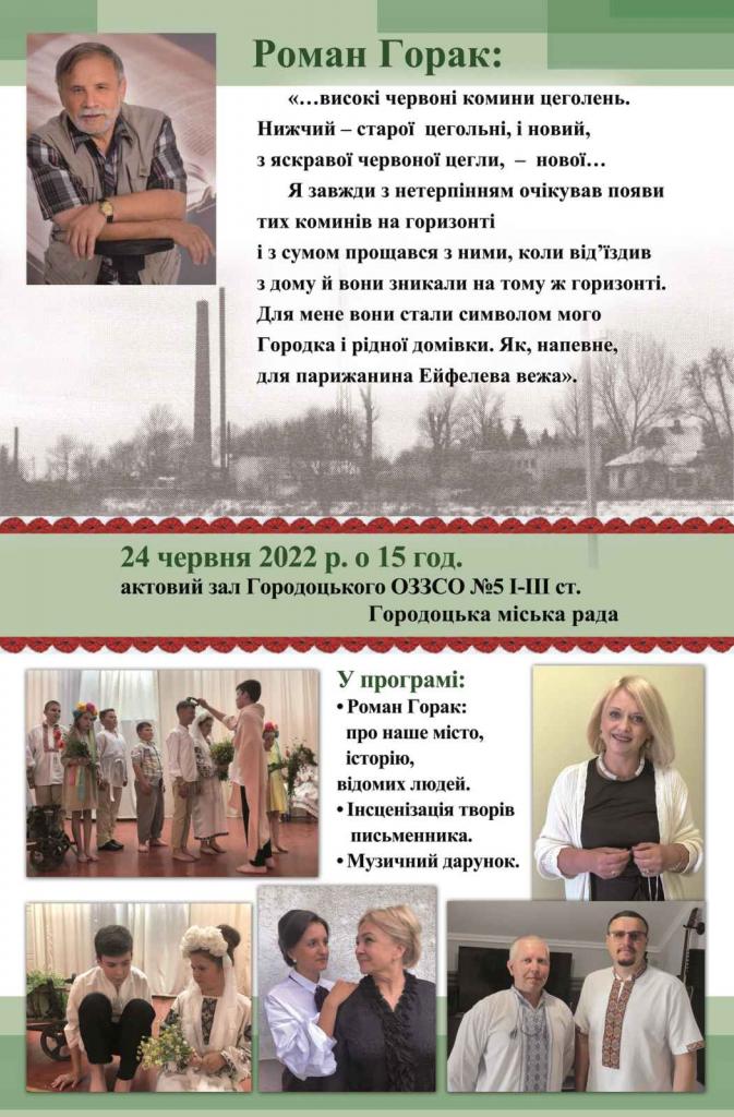 Творчий захід відбудеться 24 червня 2022 р. в актовому залі Городоцького ОЗЗСО №5.