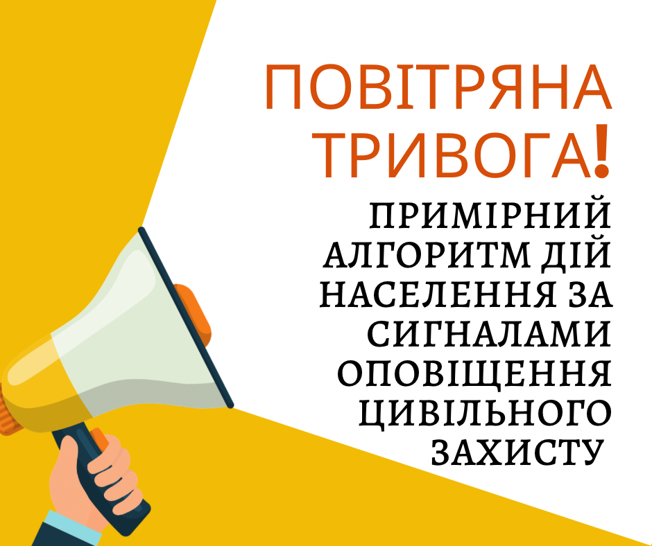 Порядок дій при отриманні сигналу: 1. Відповідальна особа у разі надходження сигналу вмикає наявну систему оповіщення навчального закладу. 2. Вчитель має миттєво сповістити учнів (словесно) про загрозу або виникнення надзвичайної ситуації та припинити навчальне заняття. 3. Відповідальна особа разом із вчителями має скоординувати хід евакуації учнів від класу до захисної споруди (укриття). 4. Класи, в яких викладають вчителі, мають бути організовані для негайного пересування двома колонами в приміщенні класу та швидкого залишення кабінету. За можливості учні самоорганізовуються для залишення кабінету та руху до захисної споруди. При обмеженому просторі для пересування учні залишають приміщення групами. 5. Відповідальні особи за евакуацію повинні знаходитись у заздалегідь визначених місцях та допомогти в організації та регулюванні швидкого руху до захисної споруди. До вчителів, які супроводжують молодші класи, приставити помічників. 6. Медичний працівник повинен знаходитись у відведеному для нього 2 місці для швидкого надання медичної допомоги. 7. Відповідальні особи за евакуацію повинні знаходитися біля виходу із захисної споруди для здійснення контролю за порядком укриття учасників освітнього процесу та швидкого реагування у разі, якщо виявиться, що хтось відсутній. 8. Учні або цілі класи, які знаходяться на подвір'ї закладу, під час сигналу тривоги повинні рухатися під наглядом вчителя або самостійно до захисної споруди. 9. У середині захисної споруди відповідальні особи повинні забезпечити, щоб учні швидко та обережно зайняли свої місця. Після того як усі учні займуть свої місця відповідальний за клас повинен перевірити наявність усіх учнів. 10. Під час перебування в захисній споруді вчителі та відповідальні особи повинні провести заходи, щоб заспокоїти дітей та всіх, хто знаходиться в ній.