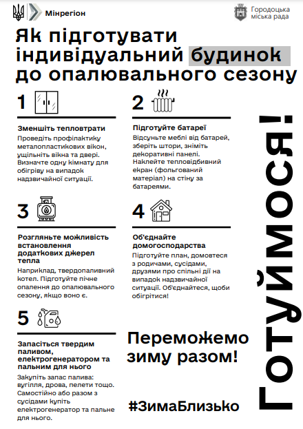 Опалювальний період 2022-2023 років буде найскладнішим в історії України і його упевнене проходження напряму залежить від послідовних та скоординованих дій центральної і місцевої влади та громадян. Враховуючи актуальність питання, а також з метою об’єднання спільних зусиль, Міністерство розвитку громад та територій України розпочинає комунікаційну кампанію «Готуймося!», спрямовану на спонукання громадян індивідуально готуватися до опалювального сезону. Адже одним із важливих заходів підготовки є проведення побутової термомодернізації власниками квартир та індивідуальних будинків. Саме первинні заходи дозволять зменшити втрати теплової енергії та створити оптимальний мікроклімат в оселях. З цією метою Мінрегіон розробив інформаційно-графічні матеріали, спрямовані на підвищення обізнаності громадян щодо побутової термомодернізації.