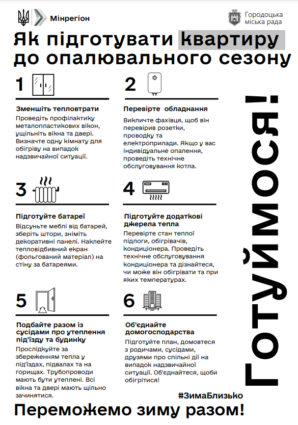 Опалювальний період 2022-2023 років буде найскладнішим в історії України і його упевнене проходження напряму залежить від послідовних та скоординованих дій центральної і місцевої влади та громадян. Враховуючи актуальність питання, а також з метою об’єднання спільних зусиль, Міністерство розвитку громад та територій України розпочинає комунікаційну кампанію «Готуймося!», спрямовану на спонукання громадян індивідуально готуватися до опалювального сезону. Адже одним із важливих заходів підготовки є проведення побутової термомодернізації власниками квартир та індивідуальних будинків. Саме первинні заходи дозволять зменшити втрати теплової енергії та створити оптимальний мікроклімат в оселях. З цією метою Мінрегіон розробив інформаційно-графічні матеріали, спрямовані на підвищення обізнаності громадян щодо побутової термомодернізації.