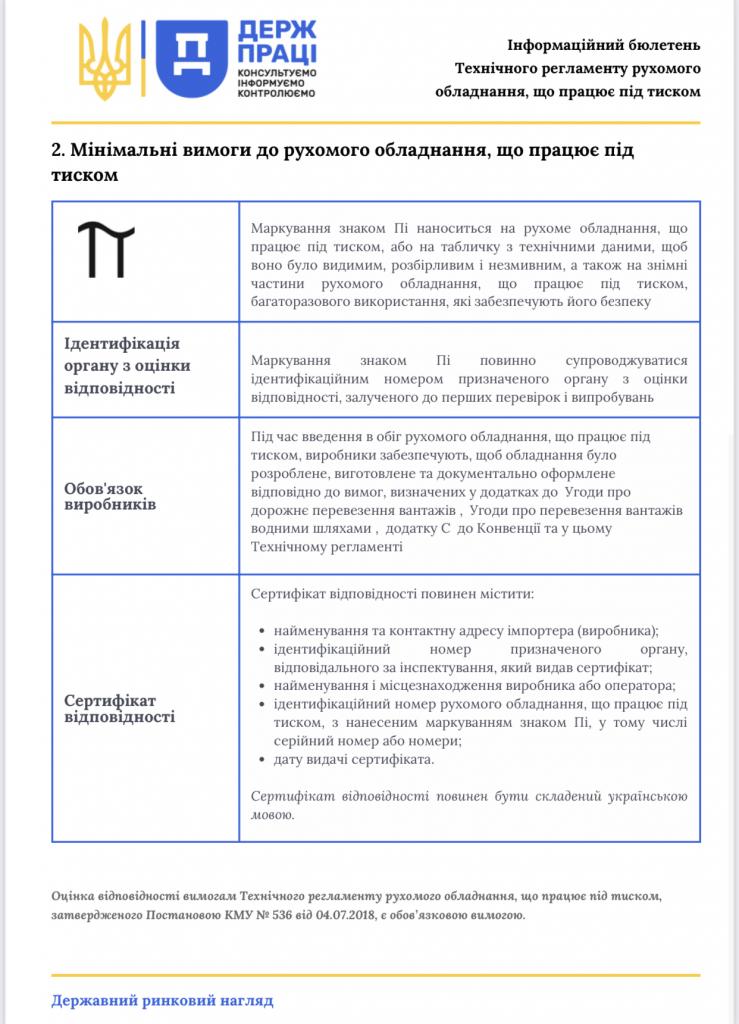 Інформаційний бюлетень Технічного регламенту рухомого обладнання, що працює під тиском