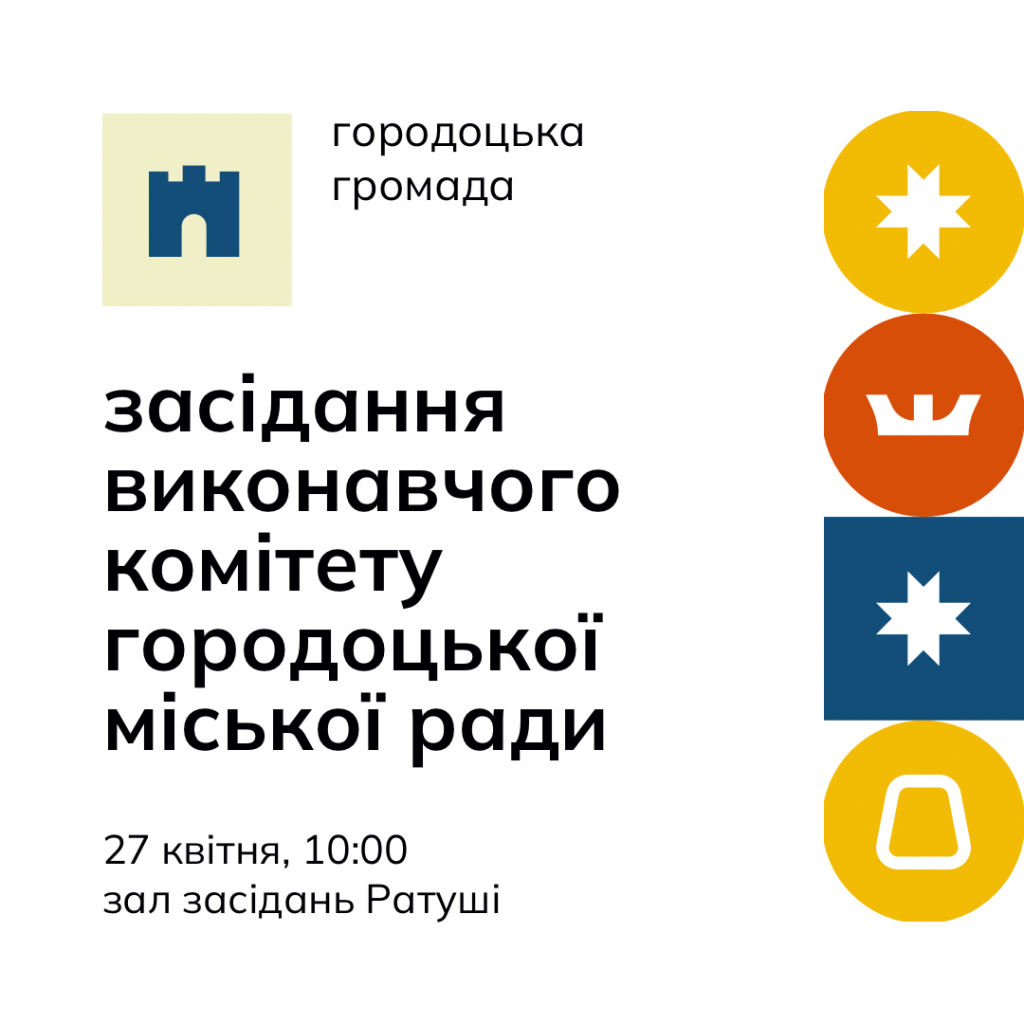 26.04.2023Повідомляємо про те, що чергове засідання виконавчого комітету Городоцької міської ради відбудеться у четвер, 27 квітня. Початок роботи – 10:00. Місце проведення – зал засідань у будівлі міської ратуші.