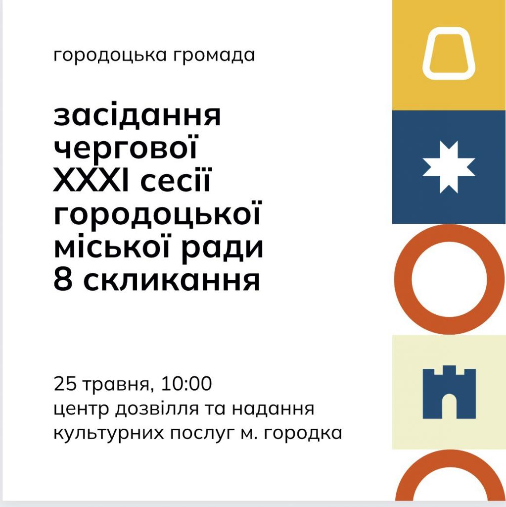 15.05.2023у четвер, 25 травня, працюватиме чергова, ХХХІ сесія Городоцької міської ради 8 скликання. Засідання відбудеться в приміщенні городоцького центру дозвілля та надання культурних послуг. Початок роботи - 10:00. Файл: проєкти рішень 31.zip