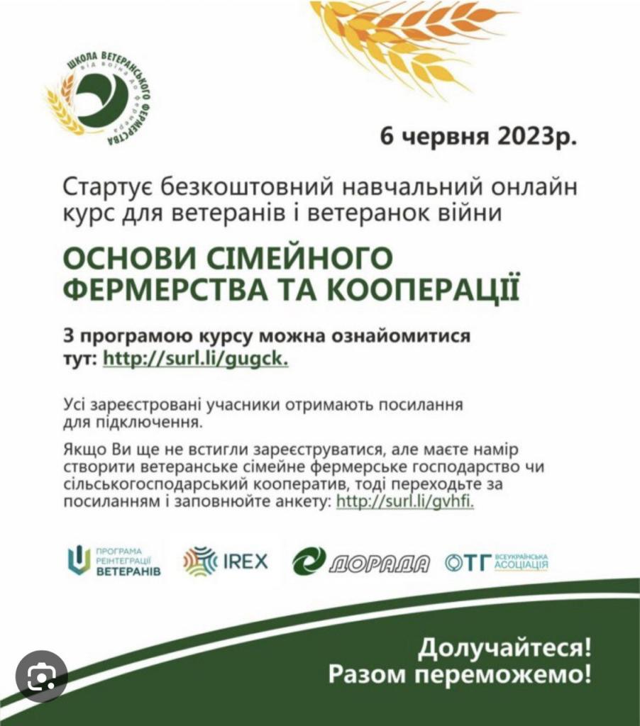 Всеукраїнська Асоціація органів місцевого самоврядування «Асоціація об’єднаних територіальних громад» у партнерстві з Національною асоціацією сільськогосподарських дорадчих служб України запрошує ветеранів чи ветеранок війни, які мають намір створити фермерське господарство на безкоштовний навчальний курс «Основи сімейного фермерства і кооперації для ветеранів та ветеранок».