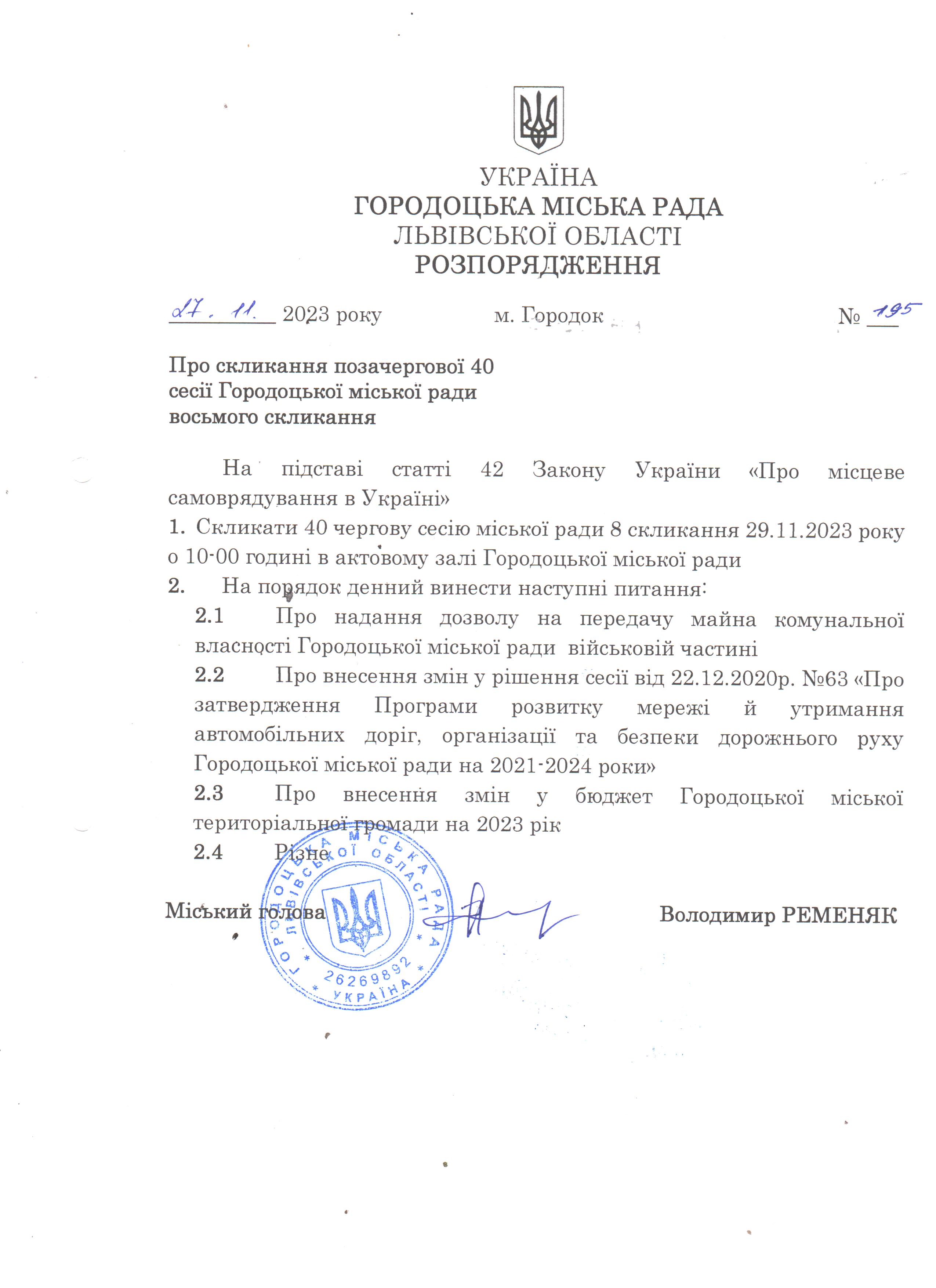 Розпорядження №195 від 27 листопада 2023 року "Про скликання позачергової 40 сесії Городоцької міської ради восьмого скликання"