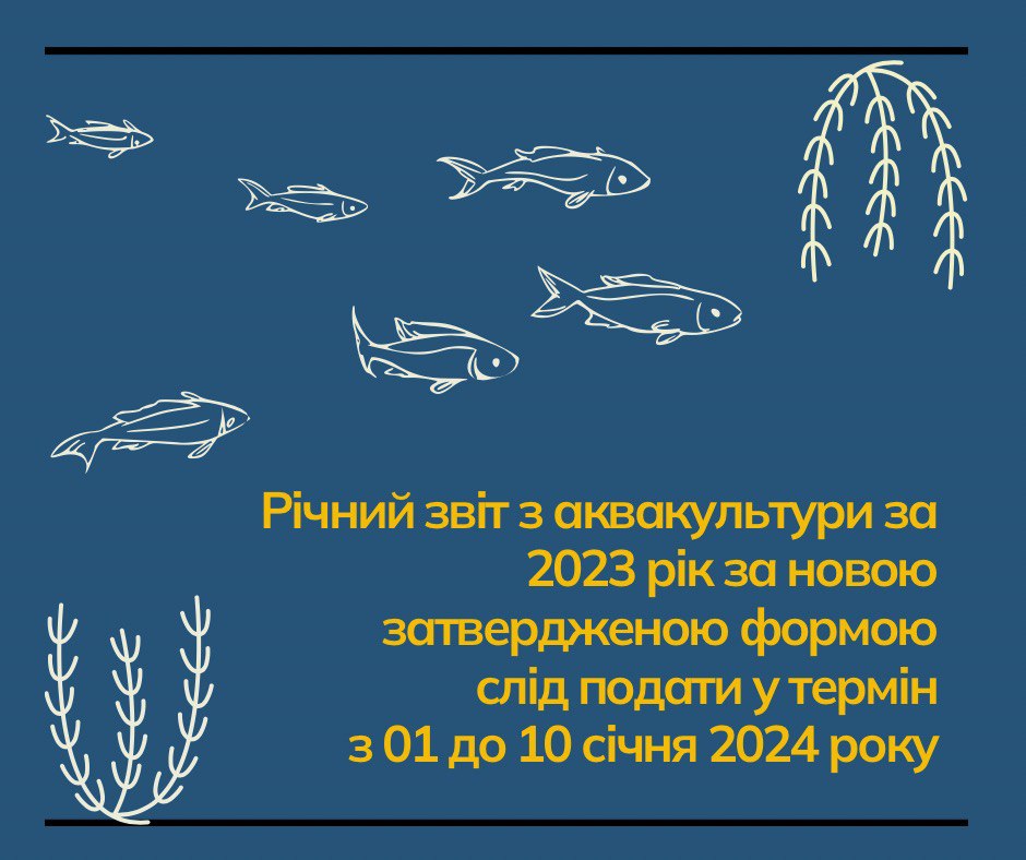 Увага! Річний звіт щодо аквакультури за 2023 рік за новою затвердженою формою слід подати у термін з 01 до 10 січня 2024 року до Управління Державного агентства меліорації та рибного господарства у Львівській області та продублювати його до департаменту агропромислового розвитку облдержадміністрації на електронну