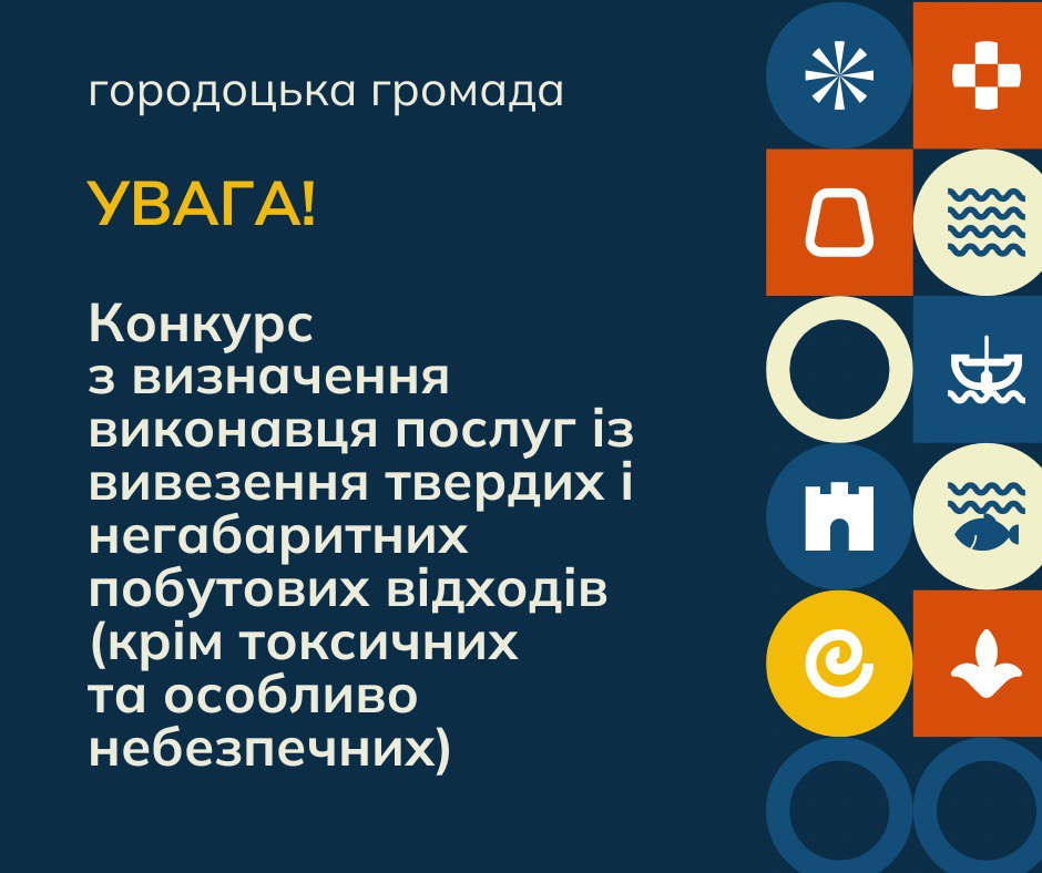 Городоцька міська рада Львівського району Львівської області оголошує конкурс на визначення виконавця послуг із вивезення твердих і негабаритних побутових відходів (крім токсичних та особливо небезпечних) з території сіл Бартатів, Воля Бартатівська, Братковичі, Галичани, Дроздовичі, Градівка, Добряни, Бар, Милятин, Підмогилки, Долиняни, Вовчухи, Годвишня, Дубаневичі, Керниця, Мавковичі, Артищів, Велика Калинка, Любовичі, Мильчиці, Зелений Гай, Побережне, Путятичі, Мшана, Повітно, Заверещиця, Залужжя, Зушичі, Речичани, Лісновичі, Родатичі, Тучапи, Молошки, Угри, Стоділки, Черлянське передмістя, Черляни, Шоломиничі. Подавати свої пропозиції на конкурс можна до 28.02.2024 р. у Городоцьку міську раду.